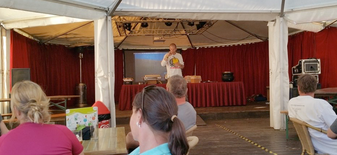 Am Nachmittag hat man sich mit dem Campsite vertraut gemacht und sich später zum Luxemburgischen Abend getroffen. Selbst wenn es am Anfang eine Reihe von technischen Pannen gab, so konnte Mikel doch schließlich die Elefantisti offiziell willkommen heissen.